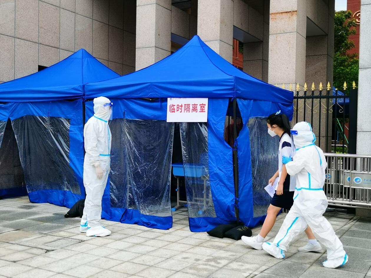 为贯彻落实中央、省、市关于新冠肺炎疫情防控的各项要求,积极应对当前疫情发展复杂形势,认真稳妥做好我市2022年中考录取计分科目笔试工作,6月14日下午,我市在广州市铁一中学(白云校区)举行中考考点防疫应急演练,市卫健委、市教育局、市招考办和各区招考办代表参加观摩。