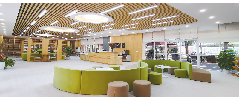 馆外繁华正盛,中央花园美景尽收眼底;馆内书墨飘香,壁上字画生辉,阳光与暖灯相映。这里既是阅读乐趣的汇聚地,也是徜徉世界的大门。