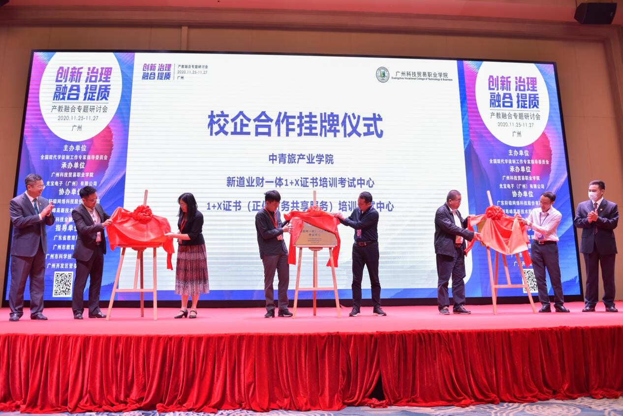 广东轩辕网络科技股份有限公司、中国银行股份有限公司广州番禺支行、广州市粤峰高新技术股份有限公司、百创通供应链科技(广东)有限公司、广州中长康达信息技术有限公司、广东省事熊智能科技有限公司等代表分别上台,与广州科技贸易职业学院院长蒋新革教授签约共建产业学院,6家企业2020年投资2000余万元在产业学院共建产教融合基地。
