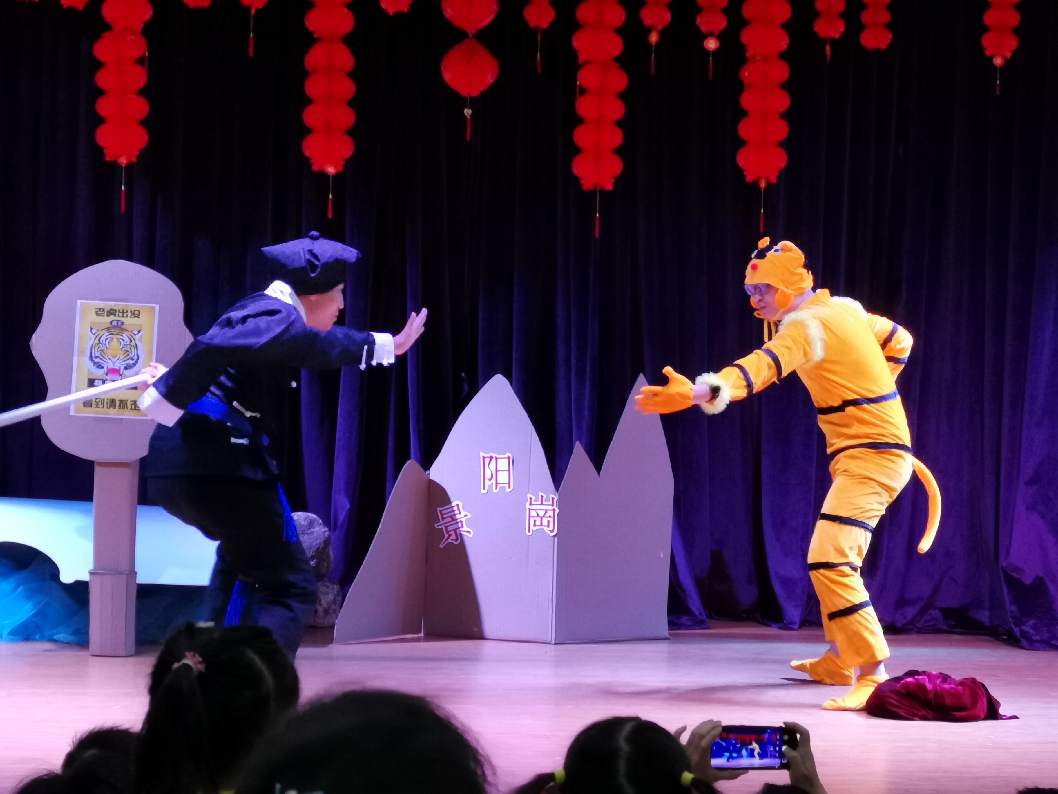 听!这边踩着京剧锣鼓点出场,操作“张飞”将军偶的孩子,模仿着闻名遐迩的《三国演义》“长坂坡”一战中的三声怒吼——“张飞在此!谁敢与我决一死战!”可谓是威震八方啊!看!那边舞台上的“孙悟空”腾云驾雾、手中飞舞的金箍棒,伴随那一嗓“嘿!妖怪哪里跑!吃俺老孙一棒”的唱念……我国家喻户晓的经典名著就这样以孩子喜闻乐见的戏剧方式呈现出来。这不仅是对中六幼儿园本土文化的传承,更是对中国经典传统文化传承的致敬!