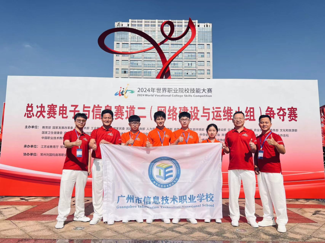 10月24日-29日,由广州市信息技术职业学校廖宇亮、张志成、朱志灏、翁熙铟四名学生组成的代表队在来自全国各地67个代表队248名选手中脱颖而出,以总成绩第一名,夺得2024年世界职业院校技能大赛总决赛(中职组)电子与信息赛道二(网络建设与运维小组)争夺赛金奖!