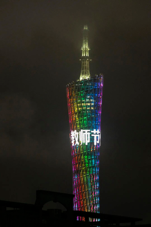 9月9日、10日两天,广州塔华灯璀璨,“老师,您好!”“教师节快乐”“以教育家精神铸魂强师,谱写教育强国建设华章”等祝福语,以城市之名,向全市教师送上崇高敬意。